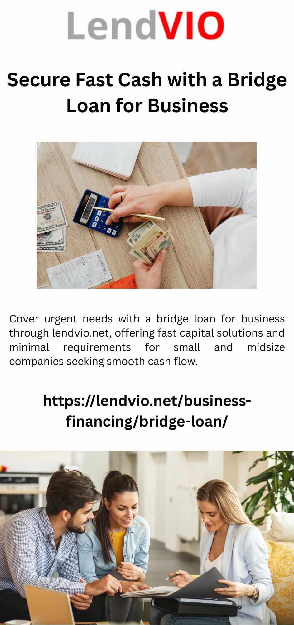 Cover urgent needs with a bridge loan for business through lendvio.net, offering fast capital solutions and minimal requirements for small and midsize companies seeking smooth cash flow.